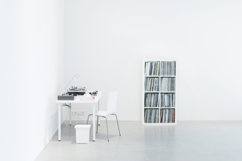 The second image stands in stark contrast. The artist Cory Archangel turned the collecting of records into an art installation with The AUDMCRS Underground Dance Music Collection of Recorded Sound (2011). He acquired upwards of 800 trance records from a retired DJ, which he then professionally archived and stored. Installed in various contexts, ranging from an art gallery to a library, audiences find Archangel’s meticulously catalogued collection alongside a binder with discographic information for each release, a set of white archival gloves in order to handle with records with, and a turntable, receiver, and set of headphones with which one can listen to the LPs. At the very least, this potential allows the records to retain some of their use-value and not simply exist as fetish objects against the pure white cube of the gallery space (though it is doing this as well), which seems to be a large part of what elevates this rather mundane practice into an “artwork.” The disconnect is further made evident by the incongruity of treating trance music, a somewhat derided and critically maligned genre of techno popular in the 90s, as worthy of the archive. This was before Lorenzo Senni‘s semi-ironic rehabilitation of the genre, but even so, the disconnect between the perceived cultural import of the collection and the manner in which it is archived and displayed is what gives the work the tension which animates it.