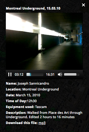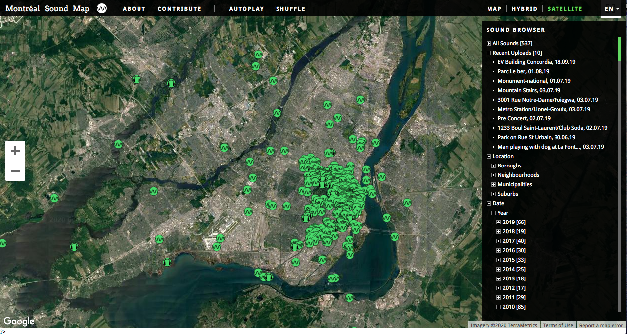 “Sound maps are in many ways the most effective auditory archive of an environment, touching on aspects political, artistic, cultural, historical, and technological. The Montréal Sound Map is a web-based soundscape project that allows users to upload field recordings to a Google Map of Montréal. The soundscape is constantly changing, and this project acts as a sonic time capsule with the goal of preserving sounds before they disappear.